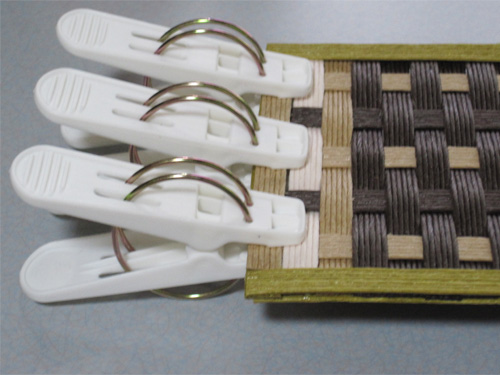 8センチ6本幅のクラフトバンドを左右(最初のところから見ると上下)と表裏に貼り、洗濯ばさみで固定しておきます。
